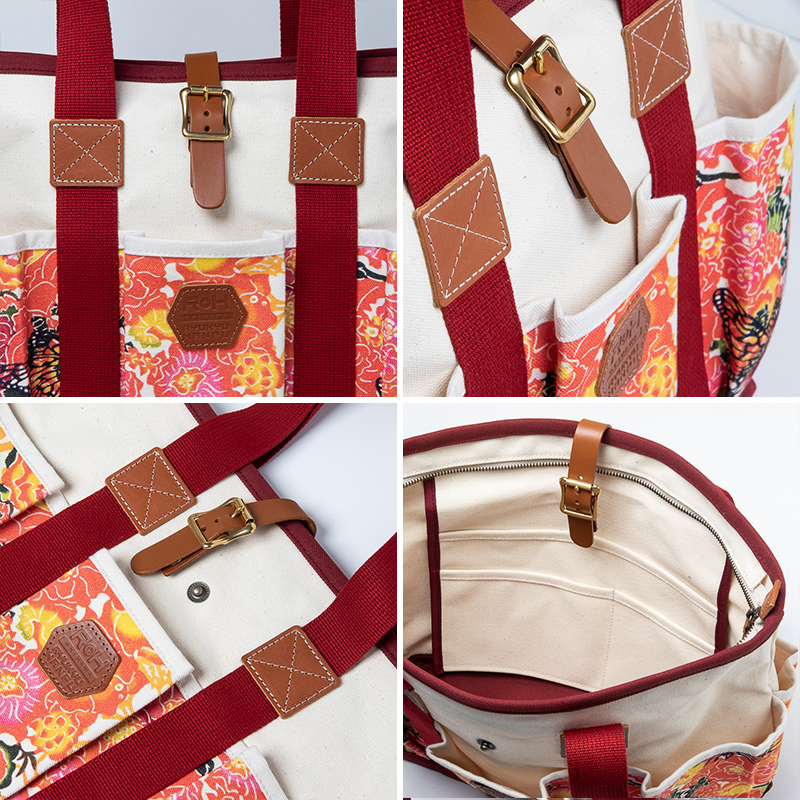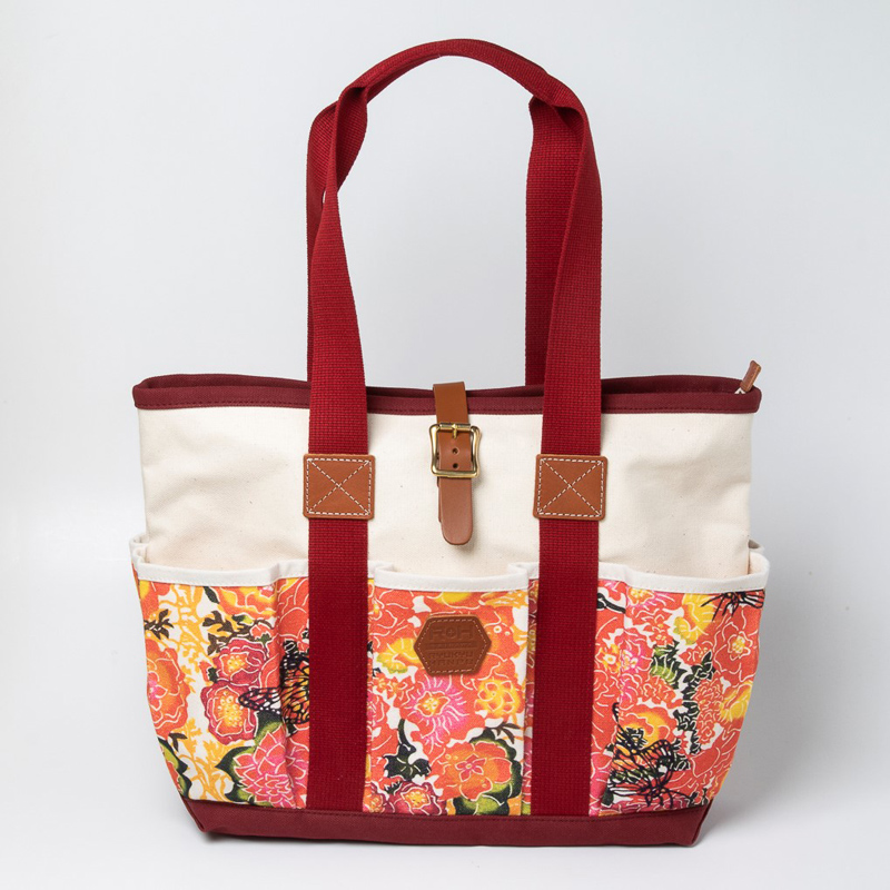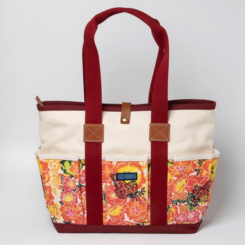 6つの外ポケットに、沖縄の人気紅型作家・新垣優香さんの作品をプリントしています。