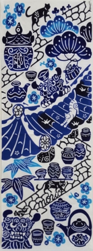 沖縄の焼き物(やちむん)がもりだくさんな藍型のデザインを
